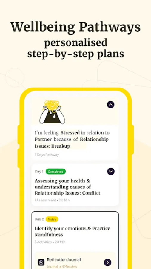 Personalised AI-powered Wellbeing Pathways: Our team of mental health professionals has curated Wellbeing Pathways that blend approaches like BT & CBT, along with mindfulness, meditation and breathing exercises to create a personalised plan tailored to your needs.