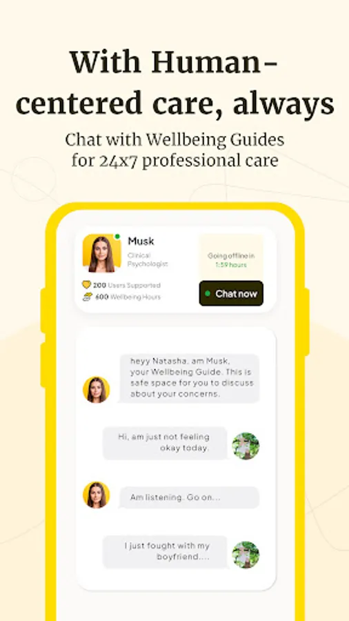 24/7 Wellbeing Guides: Connect with our professional Wellbeing Guides, who are available for chat, create your safe space and offer counselling support wherever you need it. Trained to help with a wide range of mental health concerns, including Depression and self-care, our Wellbeing Guides provide 24x7 confidential support in 10+ languages. Enjoy the first 24 hours of Instant Care Chat completely free for all your mental health concerns.