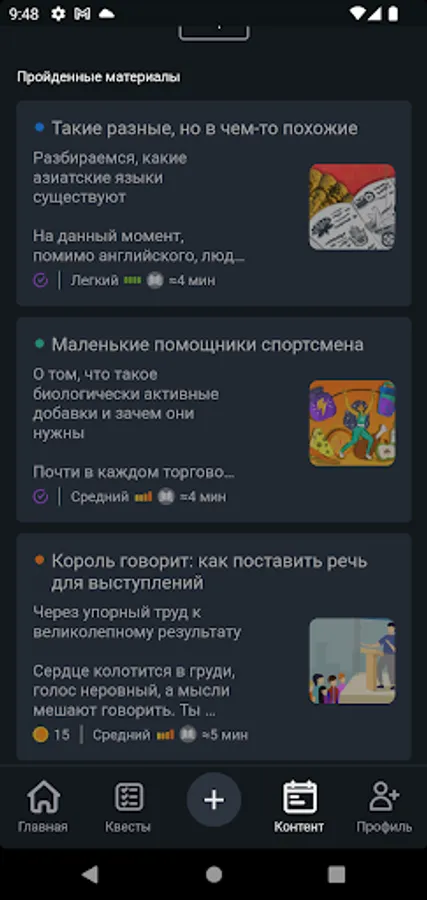 The daily tasks in the app are designed to diversify your life, bring an element of fun into it and offer options for how and what to do to achieve balance. Complete quests, get development points and coins that will give you access to articles.