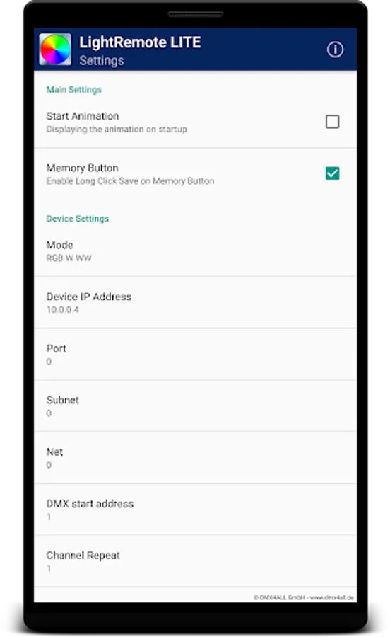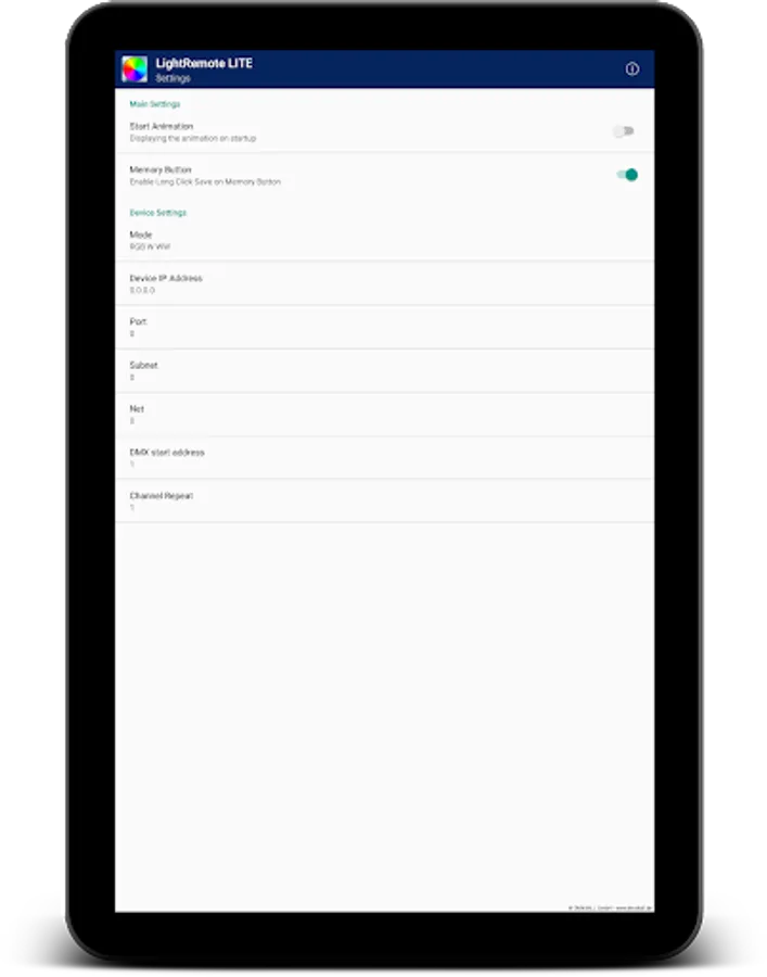 The app "Light Remote LITE" for an easy controlling of Artnet / DMX installations integrates a user-friendly design, an attractive arranged surface with the possibilities of easy color Settings.