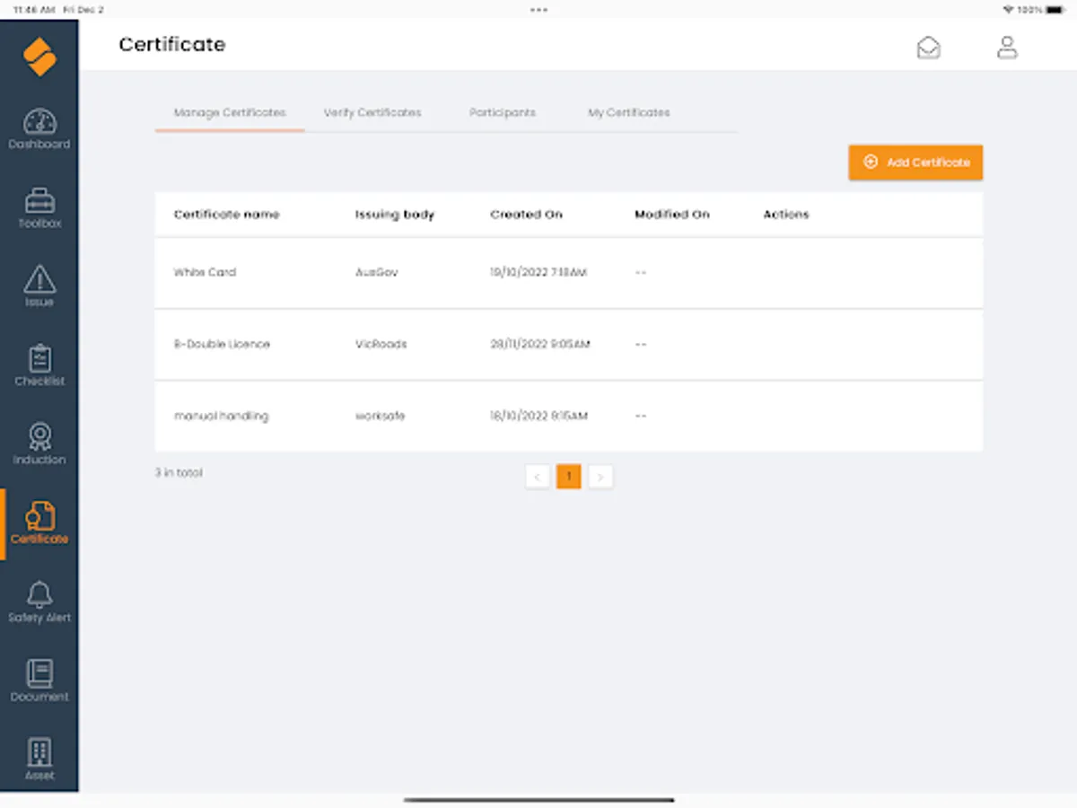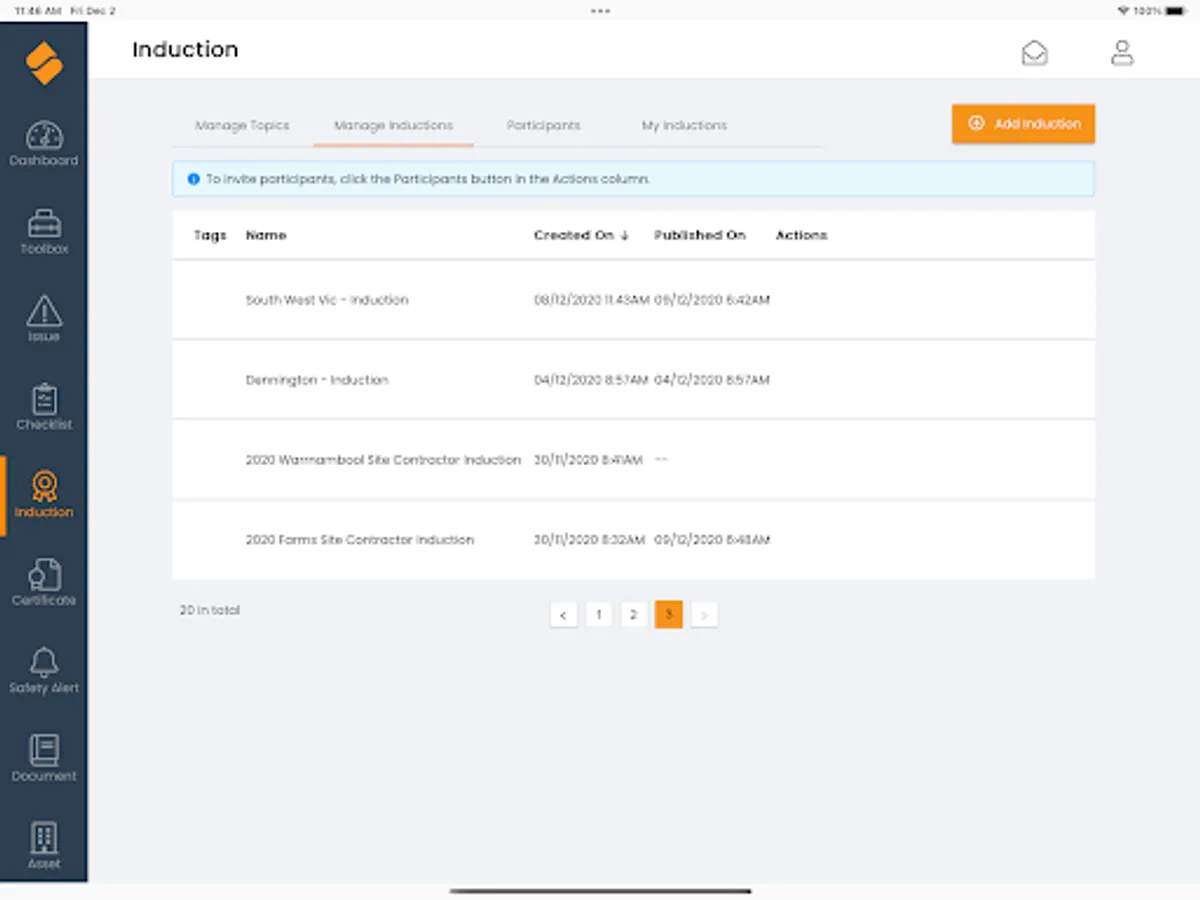 - Inductions and Certificates: Create Inductions for your team with our easy-to-use content creator, use videos, images and text to foster learning and understanding. Our certificates module ensures all licences and qualifications remain current. All valid Inductions and Certificates have a digital QR code that anyone to review their validity at any time.
