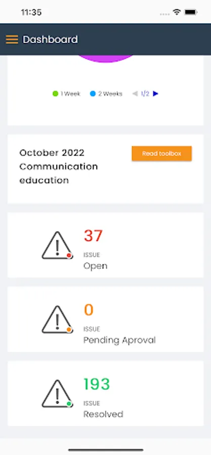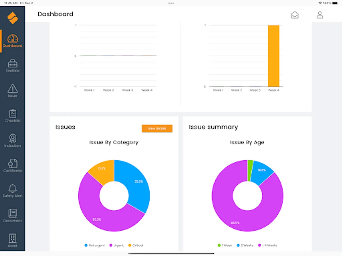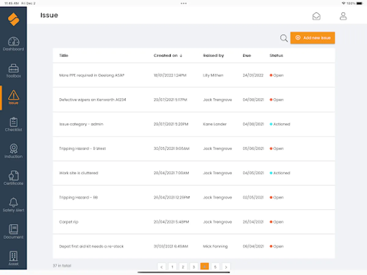 - Issue Management: Anyone in your organisation can create an issue whether it be a tripping hazard or concerns around working conditions. Issues are assigned to resources for corrective action and tracked through to resolution.