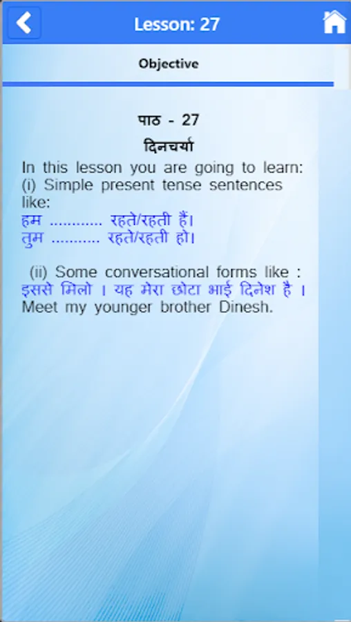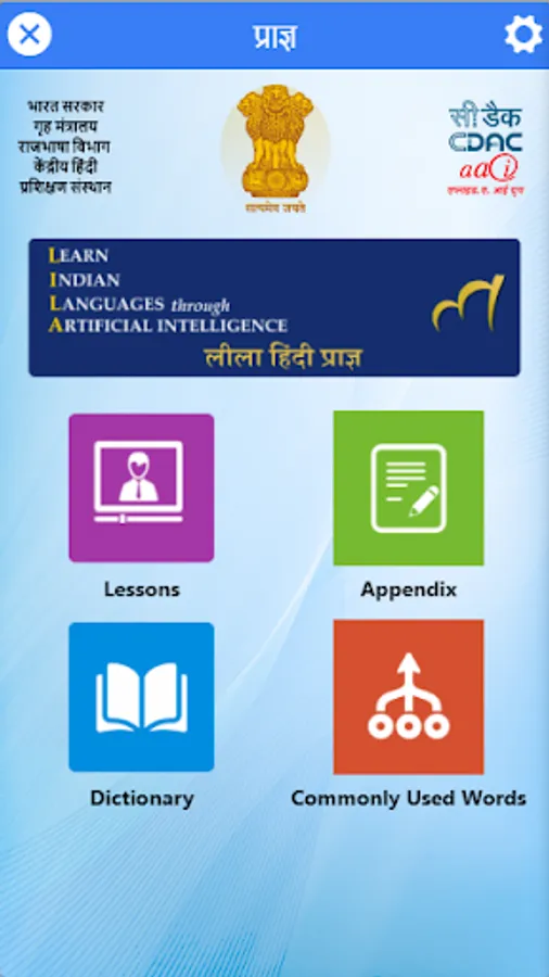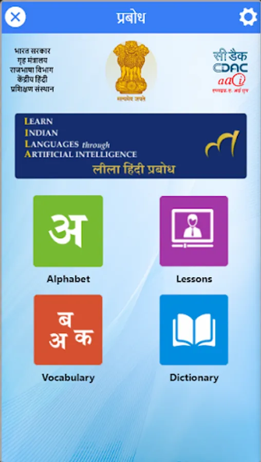 LILA-Rajbhasha (Learn Indian Languages through Artificial intelligence) is a multi-media based intelligent self-tutoring application for learning Hindi. Using LILA, learning a language on your mobile can indeed be as enjoyable as playing. Hindi Prabodh, Praveen and Pragya packages offer a user-friendly and effective tool to learn Hindi through the medium of English, Assamese, Bangla, Bodo, Gujarati, Kannada, Kashmiri, Malayalam, Manipuri, Marathi, Nepalese, Odia, Punjabi, Tamil and Telugu.