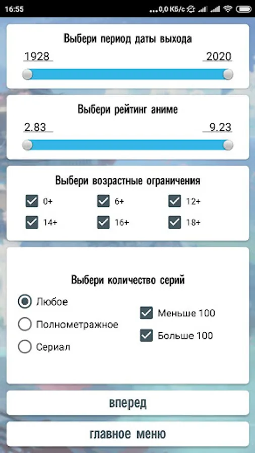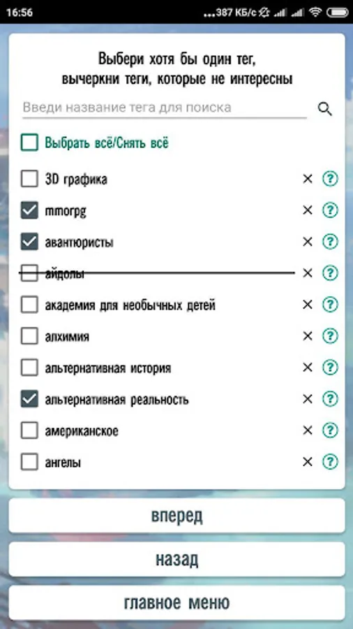 Don't know what to see? Take the test and find what interests you, select or cross out a few tags or use a random search! And you can go to viewing on your favorite sites directly from the application!