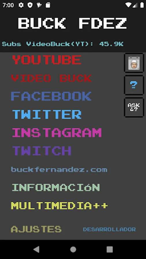 Fernandez Buck app where you can find links and shortcuts to youtube channel, twitch, facebook, twitter, music created by Buck and much more.
