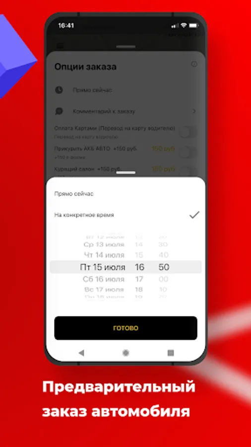 Change the order time from “Right Now” to the desired date and time. The car search will begin shortly before the start of the trip, then the car will arrive at the appointed time.