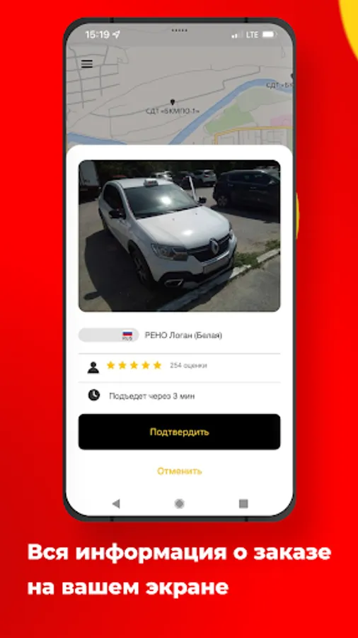 Choose the address of the car and the destination, then order a taxi in 1 click. The screen will show all the information about the assigned crew, its location on the map and the time before submission.