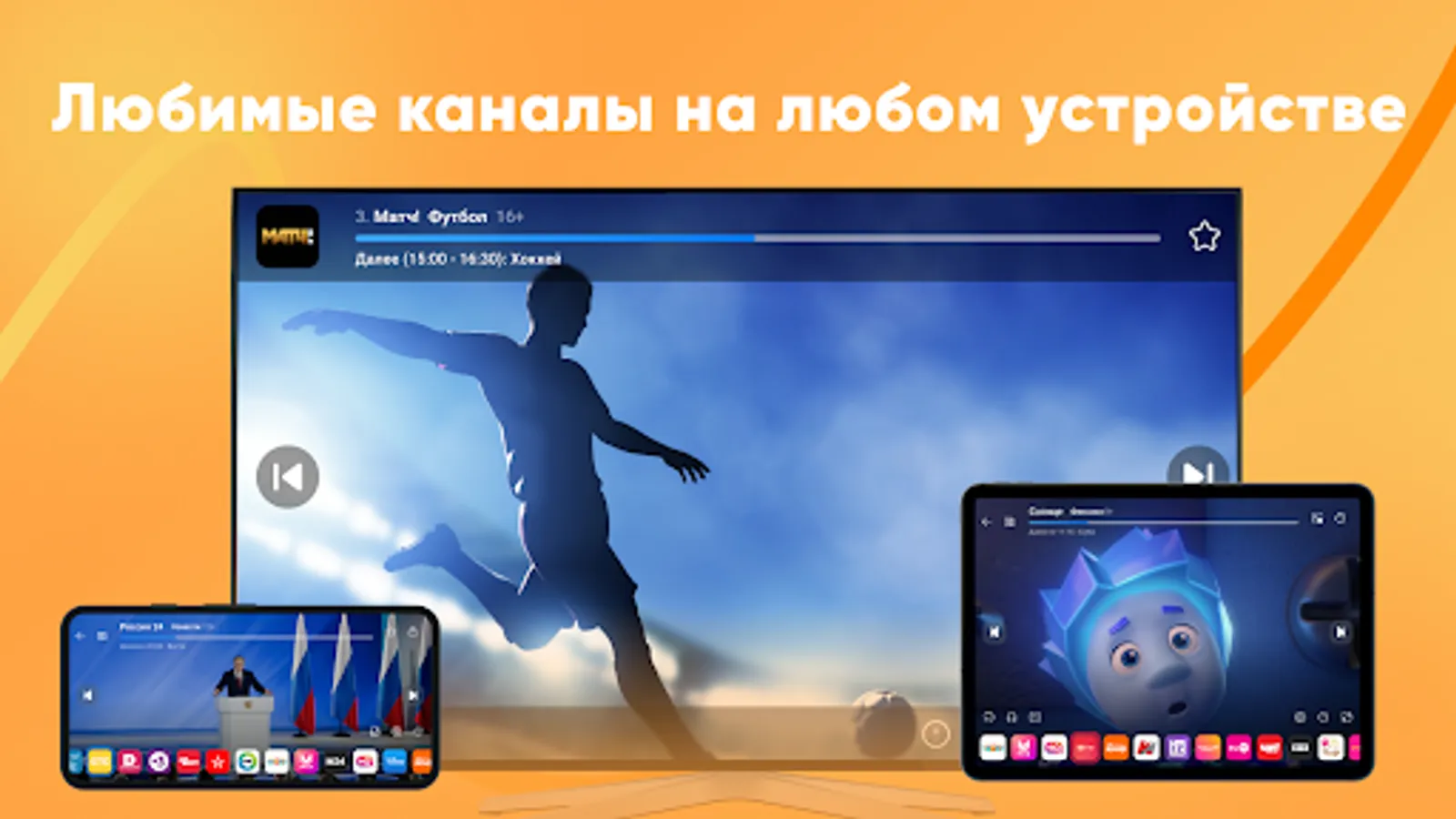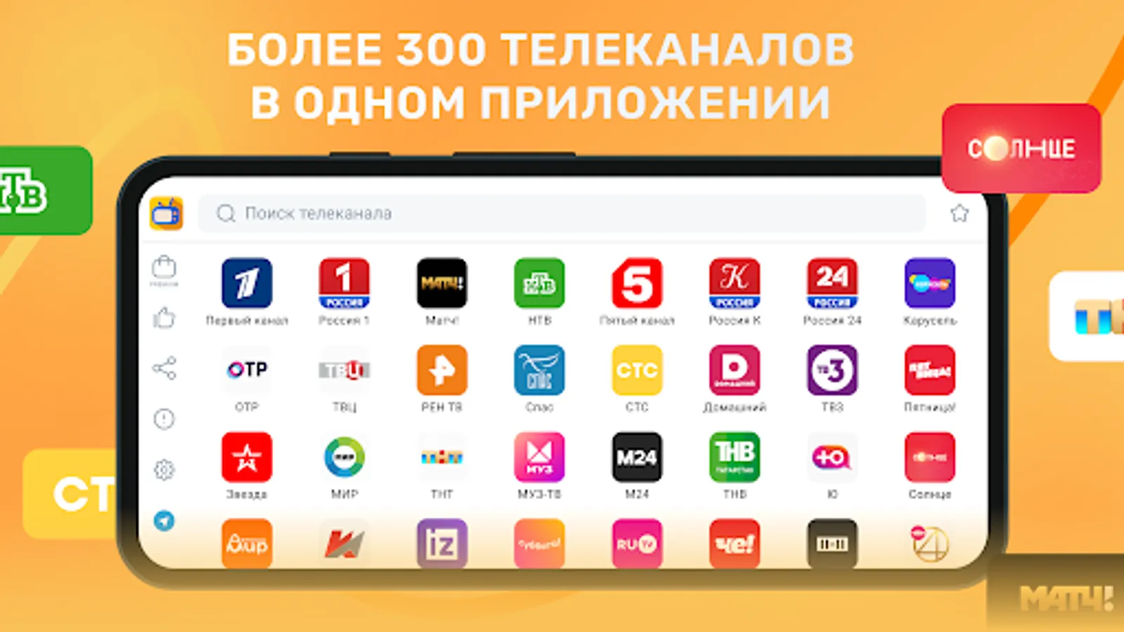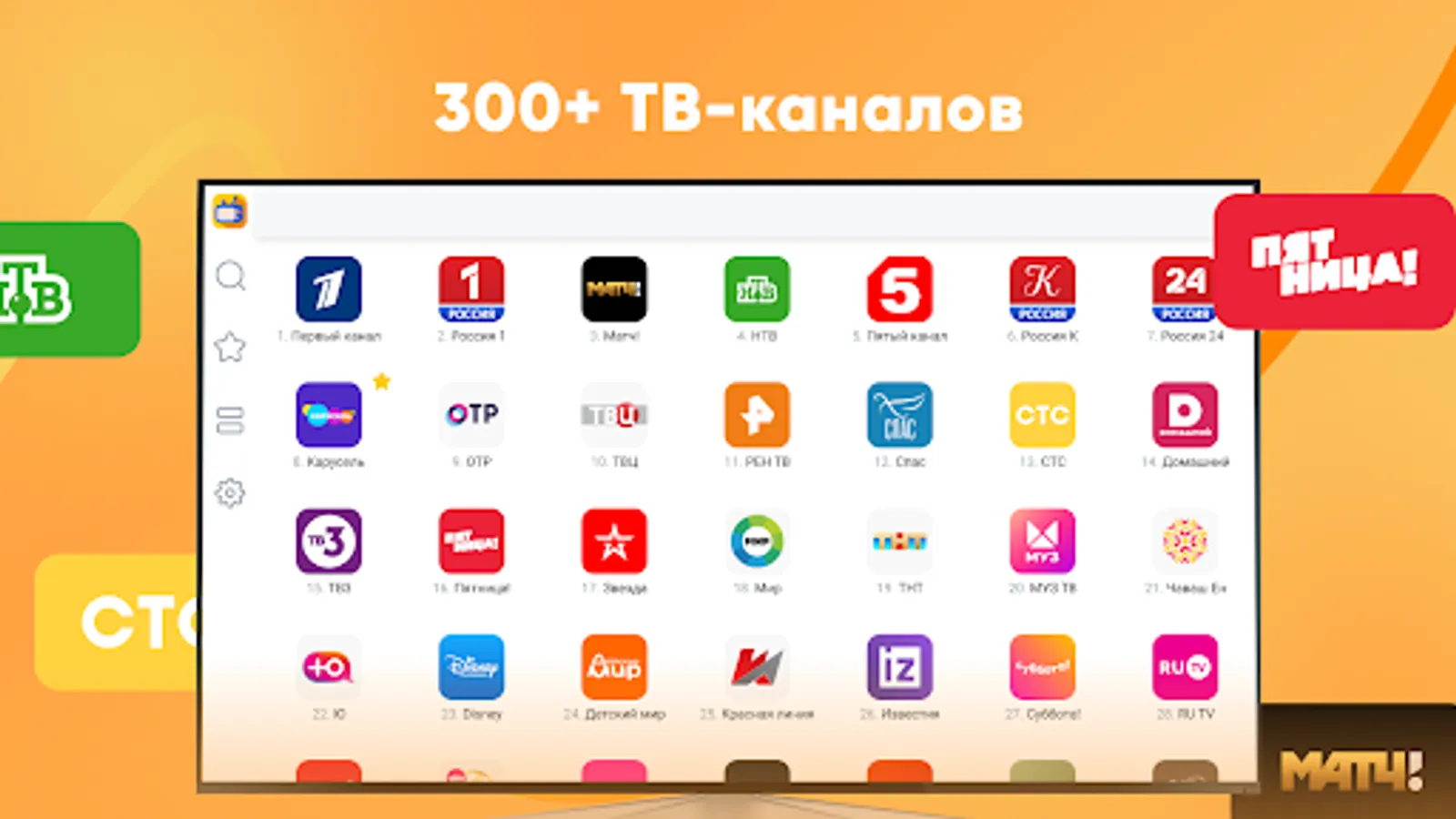 300+ online TV channels for free - to everyone, anytime and anywhere (at least in the territory of the Russian Federation). Pervyy, Russia 1, Russia 2, Russia 24, TNT (and TNT premier), Russia - Culture, World, Channel Five, Che, Match (and Match Premier), Zvezda, Friday, NTV (and NTV Plus), Karusel, STS (and STS love), Domashny, 2x2, Yu, Moscow 24 and other TV channels