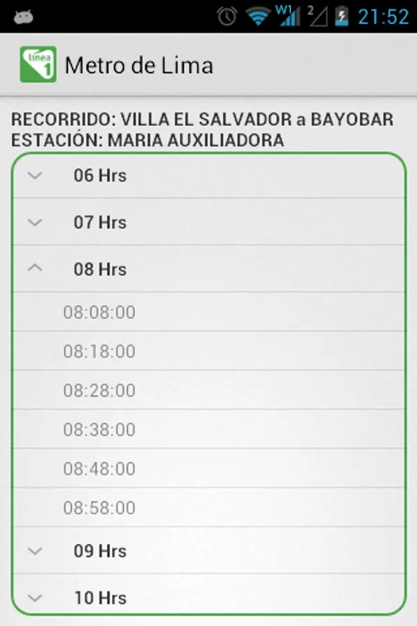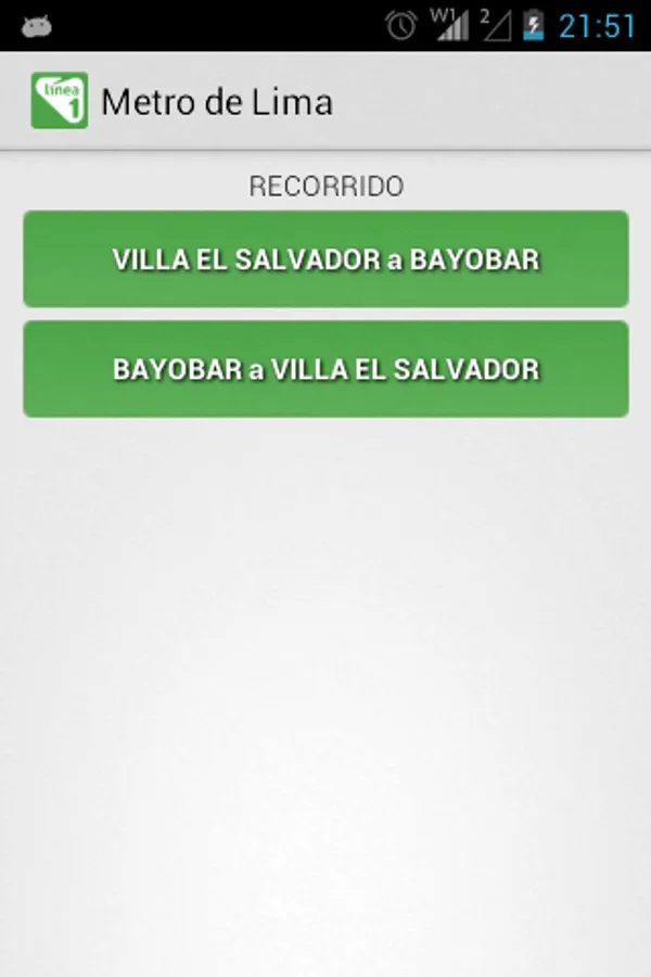 App that allows the display of departure times of the Lima Metro (line one); the timetables to visualize is with respect to the route: Villa el Salvador to Bayobar, and Bayobar to Villa el Salvador, option to select in the main window.