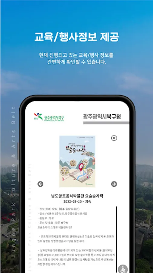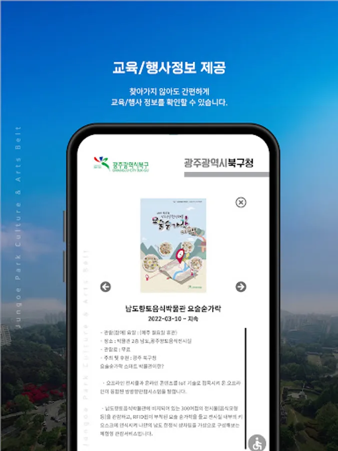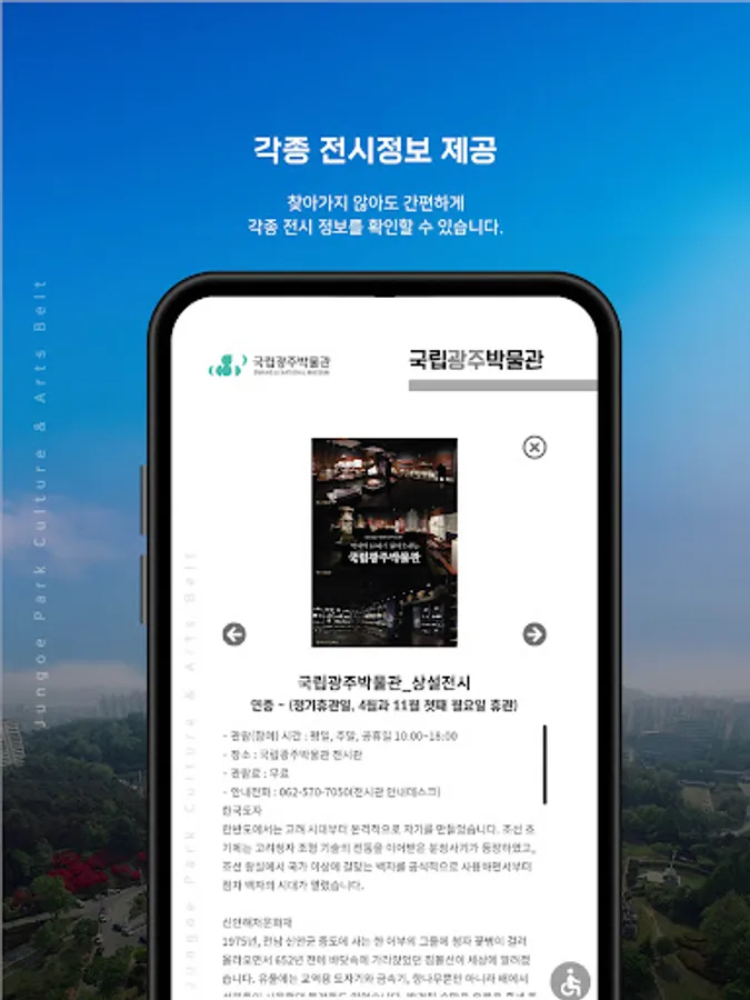 You can view all performances/exhibitions/events/educational information of Jungoe Park Culture and Art Belt in Buk-gu, Gwangju at once.