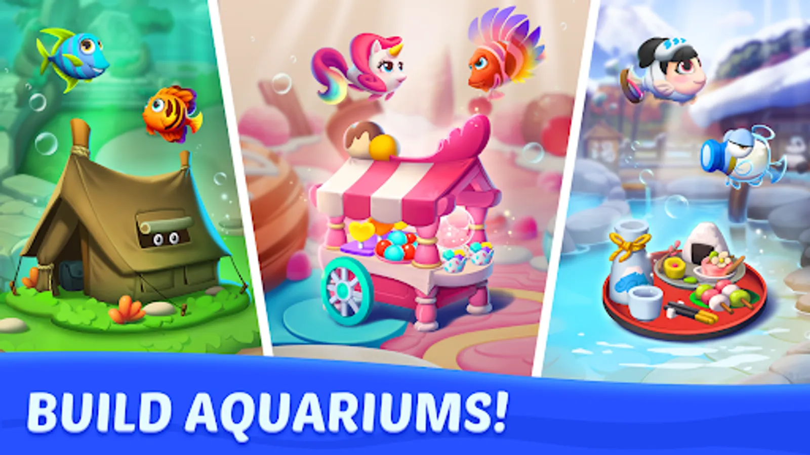 ⭐ Play match 3 puzzle games with all your lovely fish friends in those beautiful aquariums designed by yourself!