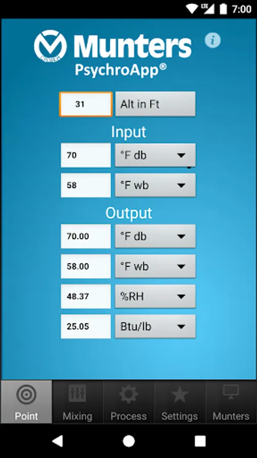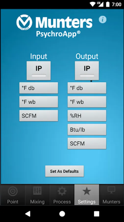 The input and output values for PsychroApp™ can be set to different units providing an easy means to make conversions.