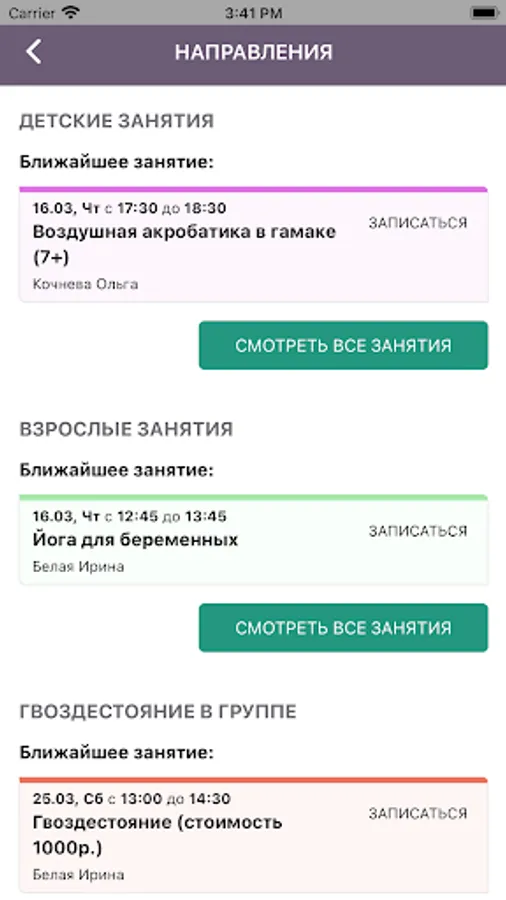The possibility of recording, canceling registrations for classes, viewing the schedule, news, history of payments and visits is open.