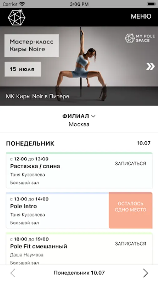Welcome to My Pole Space, the leading pylon school in Moscow and St. Petersburg. You will like it with us! We teach all directions of the pylon from tricks to a variety of dance, we conduct courses for teachers around the world, we have a single thought-out teaching system and groups divided into levels: from the most beginner to the extremely advanced. We are fanatics of our work, and we intend to infect you with it. In this application, recording for classes and a little more.