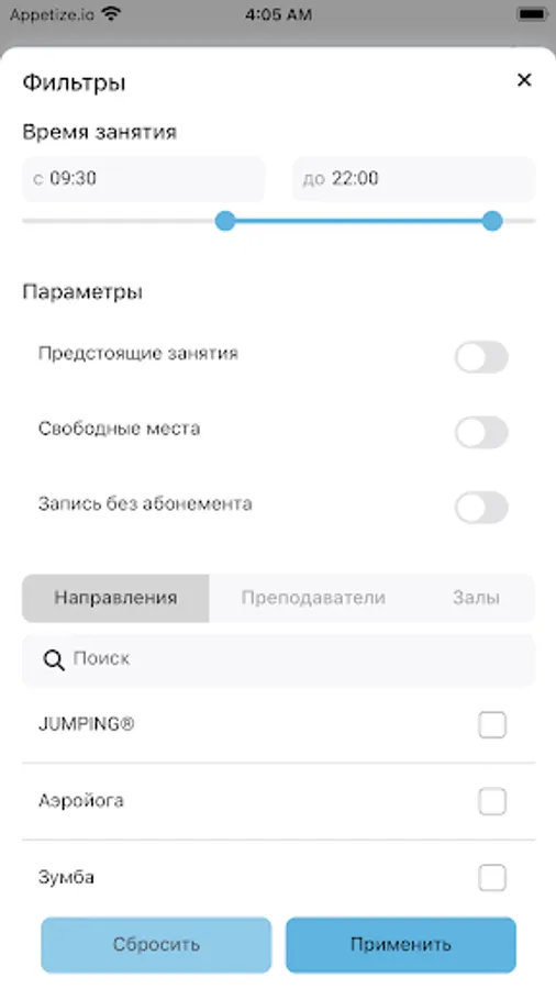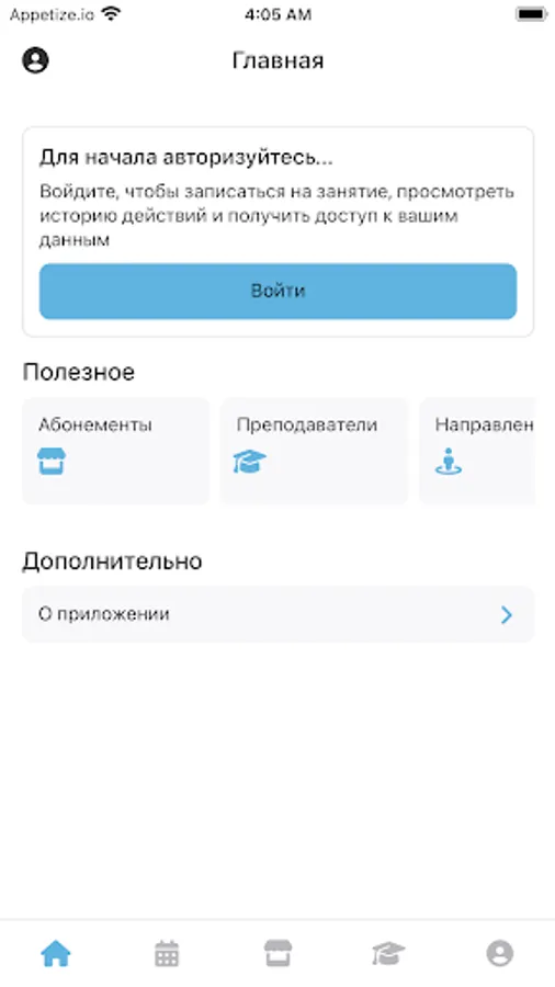 It is possible to register, cancel registration for classes, view the schedule, news, history of payments and visits.