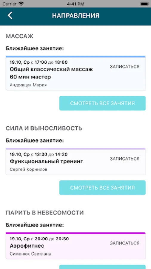 The possibility of recording, canceling registrations for classes, viewing the schedule, news, history of payments and visits is open.