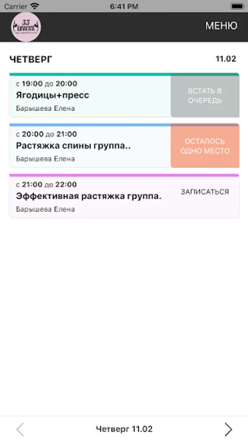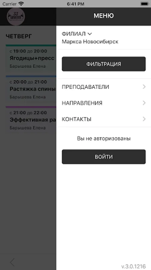 Application for clients stretching studio 33 twine Novosibirsk. This application allows you to view the current schedule and independently recorded at the studio sessions stretching twine 33, as well as monitor the status of your current subscription and view payment history and visits.