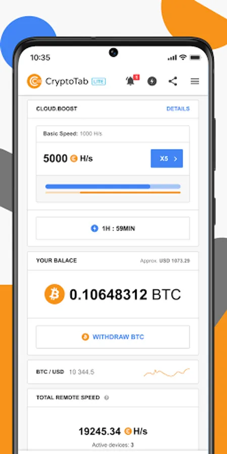 Enjoy super-fast Internet surfing and advanced browser features, watch movies, play online games or do whatever you're used to and at the same time monitor your hash rate. You can control your Cloud.Boosts, add unlimited amount of remote devices and observe BTC balance rising. The balance is updated every 10 minutes — withdraw funds immediately and an unlimited number of times per day, without any commissions. Double benefit: use a truly modern browser and get a stable profit. Sounds amazing? But it is true, so go and try it! Join the community of more than 20 million people who have already enjoyed the advanced features of the CryptoTab Browser on mobile devices!