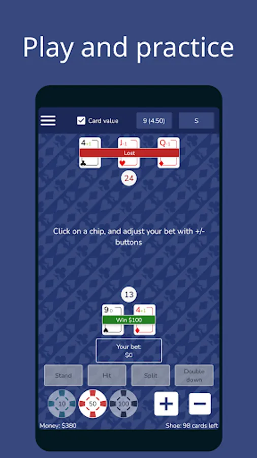• Learn and practice card counting and basic strategy in a real game scenario.