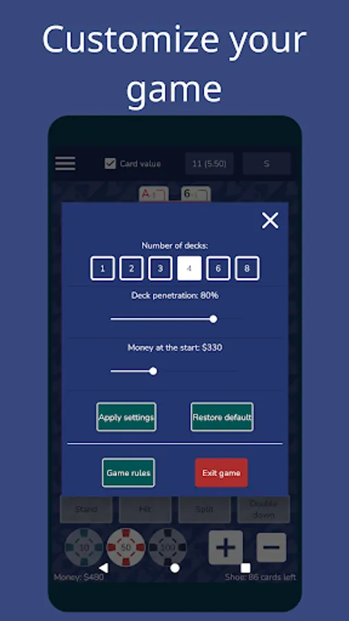 Blackjack: Card counting and strategy is an exciting game and a trainer in one. Blackjack is a casino game that can be affected by the right amount of knowledge and skills. Become an advantage player by practicing card counting and basic strategy. This app will help you master both methods. Play and learn simultaneously, sharpen your skills easily and much faster. Train the Hi-Lo method - the most popular card counting system. See for yourself that you can beat the dealer!