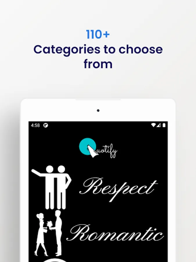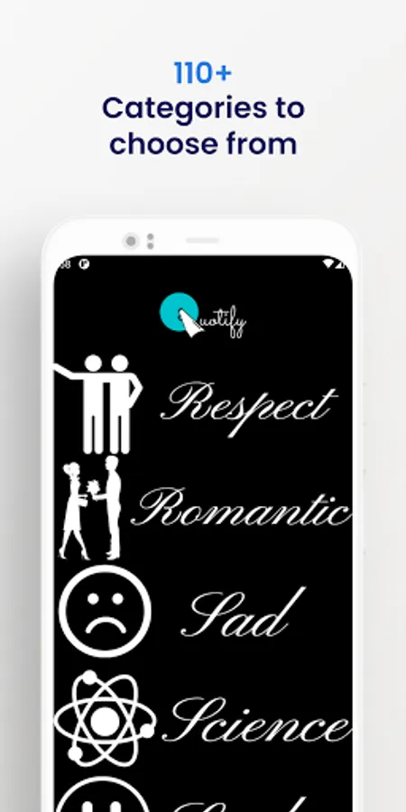 Quotify contains more than 100000 quotes, captions and sayings. Gone are the days when you were scratching your head to find the perfect quote or caption for your selfie or picture. Now you can explore more than 110 categories and find the perfect quote that fits your need.