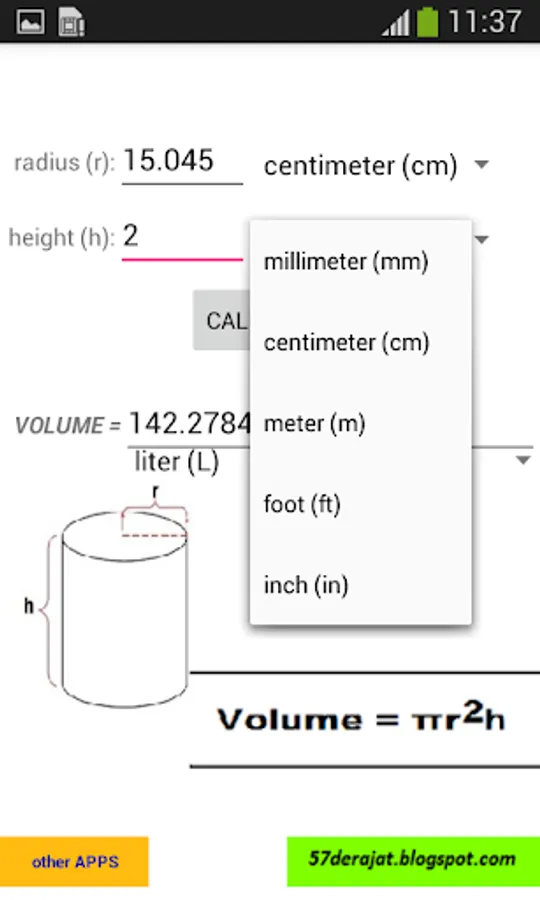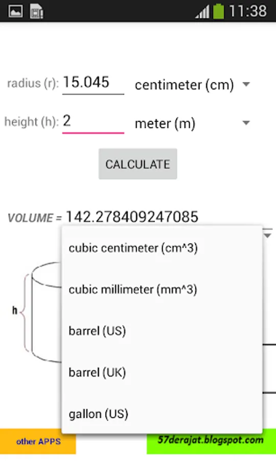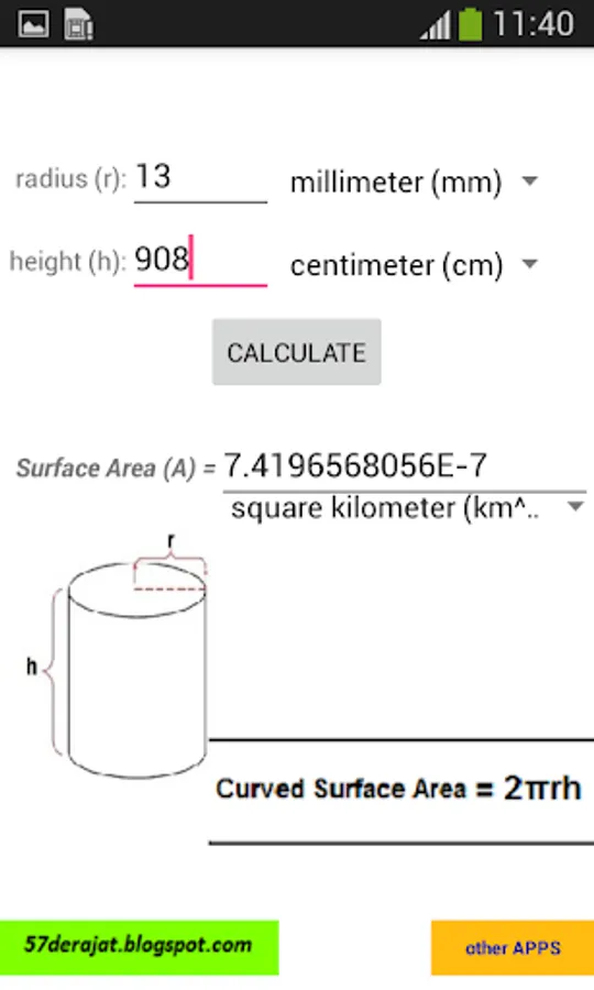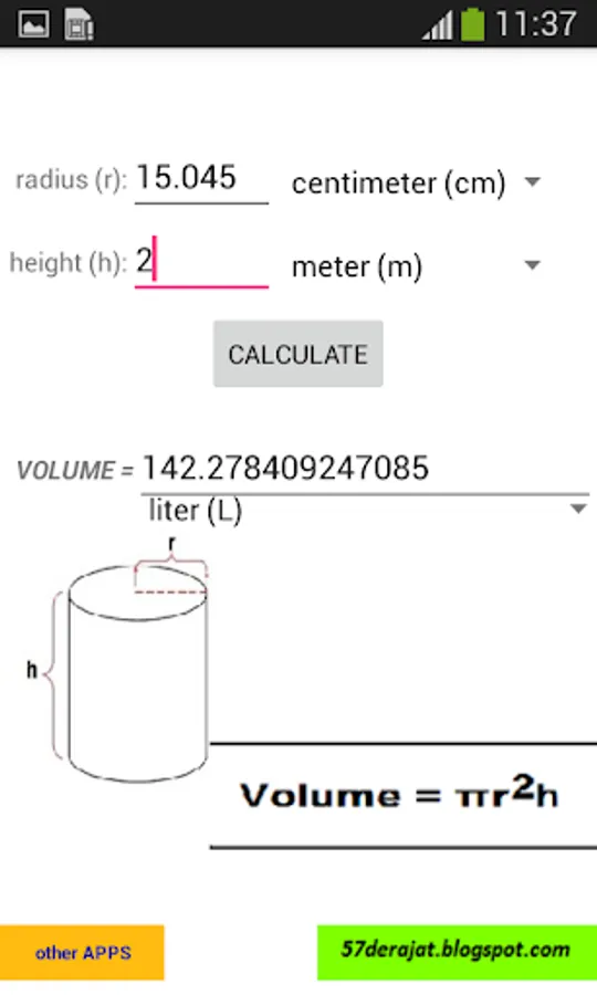 Use the Cylinder Calculator to calculate height, radius, volume, curved surface area, areas of the top and bottom circles, or total surface area of a cylinder.
