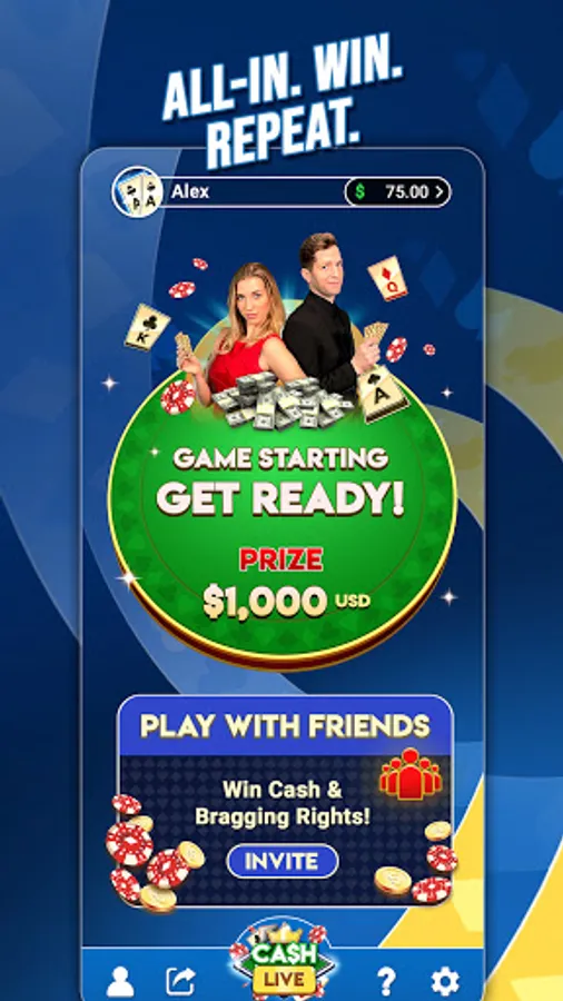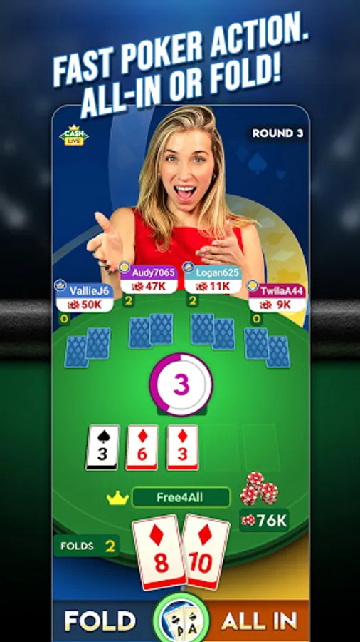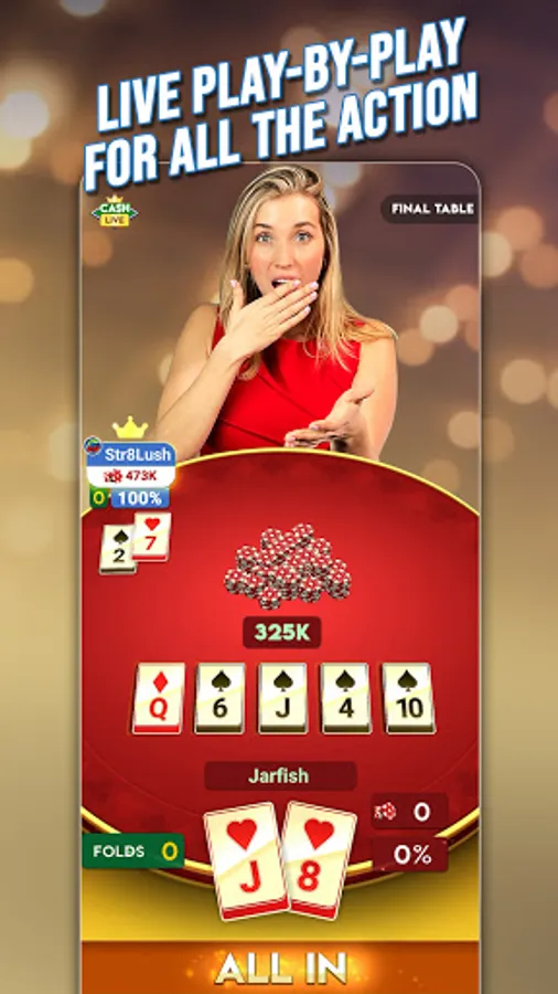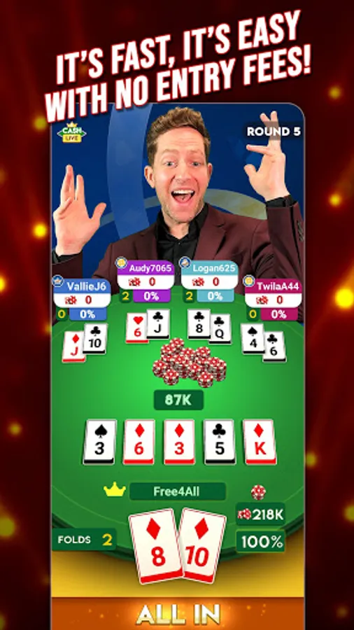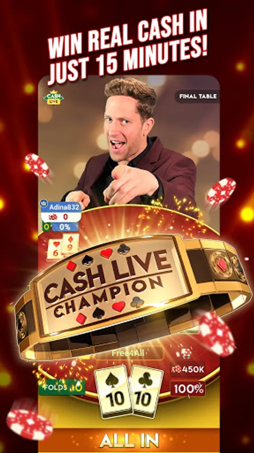 Every day, tune into CASH LIVE to play a live hosted, fast All'in or Fold poker card game. See if you have what it takes to make it to the final table spotlight.