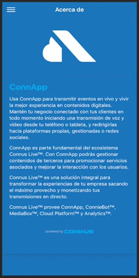 Use ConnApp to broadcast live events and enjoy the best experience in digital content. Keep your business in touch with your customers starting a voice and video transmission from your phone or tablet, and redirect the content to your own platform, managed systems or social networks. ConnApp is an essential part of the Connus Live™ stack. With ConnApp you'll be able to manage third party content to promote associated services and improve interaction with customers. Connus Live™ is a friendly solution to transform your business experiences profiting and cashing your live broadcasts. Connus Live™ provides ConnApp, ConnieBot™, MediaBox™, Cloud Platform™ and Analytics™.