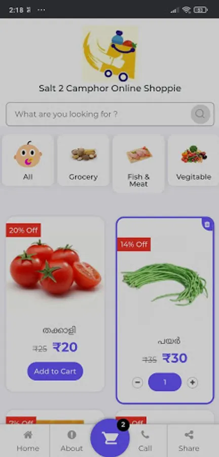 Salt2Camphor online shoppie - Download this app for a delightful shopping experience. By downloading this free online shopping application on your Android phone, you can effortlessly browse our collection from multiple categories including Grocery, Vegetables, Bakery, Fish, Meat, Fruits, Cosmetics, Pet food and Cream Cake etc. We offer a speedy delivery of your order at your doorstep. Delivery charges is free upto 2km on all orders above Rs.500/-. You can contact us for any product or delivery related issues.