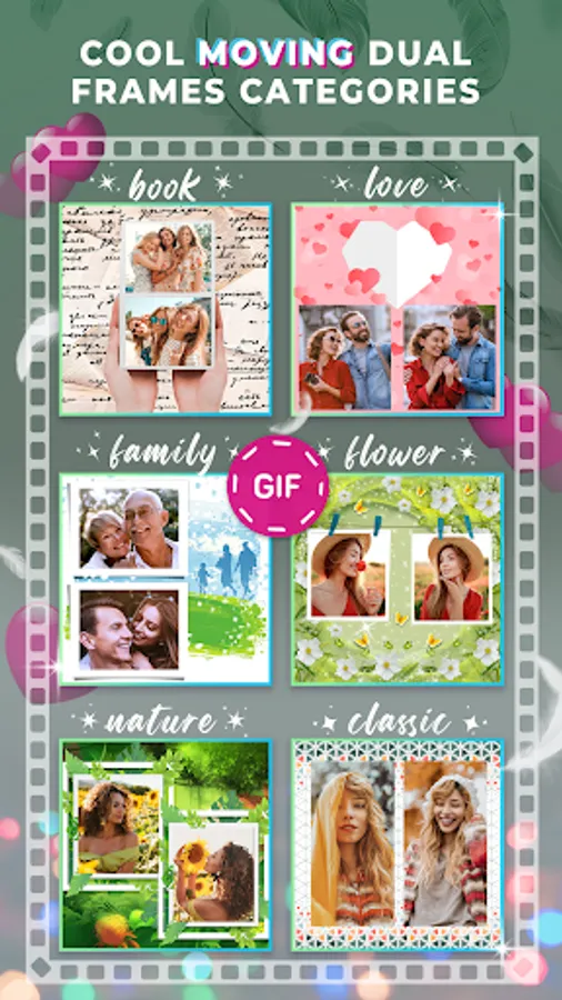 Do you wish to combine two photos and create a live photo frame? This app called “Live Dual Photo Frame” offers a huge number of live dual frame categories to choose from. Download “live frame photo editor” and see for yourself. From the start you will get to choose a dual live frame category to edit photos. There are book, love, family, flower, nature and classic frames for two pictures. The beauty of it all is that they are all animated photo frames and your images will look unique. After choosing favorite two images in one frame live, the app takes you to frame photo editing. Pick two images from the gallery or take two photos with your camera. It's a very easy photo software and everyone can have fun using it.