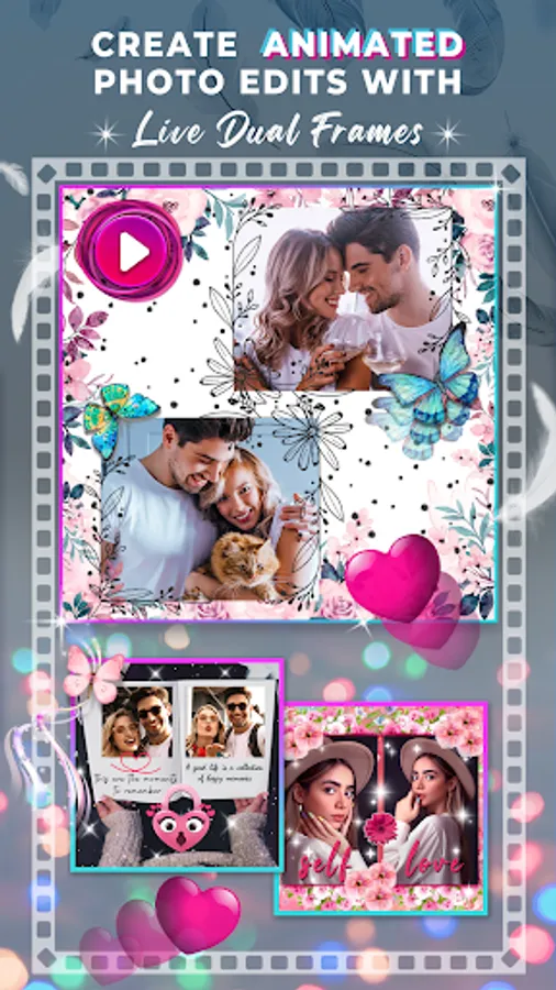 Download live frames app and decorate pics with dual live frame, stickers, filters and text. Create a live dual photo frame hd with two photos and have unique designs. Your photoediting will be next level with a live two image frame. Share your animated images with double frames on social media. This “double frame app” will help you make lovely photo edits. Your cool new designs with “dual couple photo frame” can be made very easily. Just choose two pics from gallery that you like, edit images and spend nice time. This Live Dual Photo Frame can become your new favorite “dual photo collage” app.