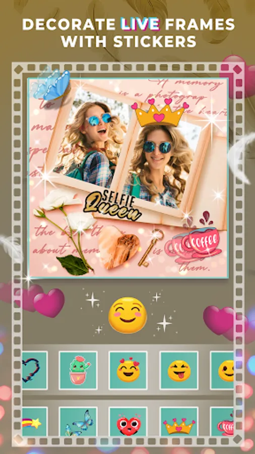 A cool collection of photo stickers is offered in live picture frame app. Make a change to two photos and show your style with stickers and frame live photos. Try an easy and simple photo sticker edit today. You can edit photos and add “dual picture frames” for cool designs. Live Dual Photo Frame is a software with cool picture stickers and gorgeous filters. Check out interesting tools and all of sticker categories found in this photo creator. If you like to put emojis, sparkle and other different photo sticker design, this app with dual picture frames is for you. Download live dual photo frame collage maker and have fun time.