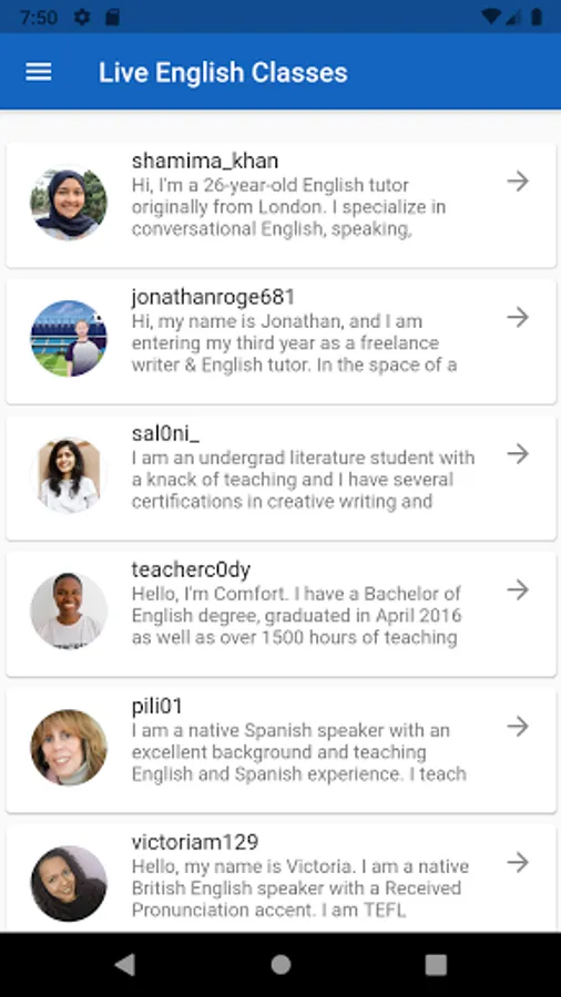 With "Live English Class App" Find online live English tutors from around the world to improve your speaking, writing, reading comprehension, and understanding of native English speakers.