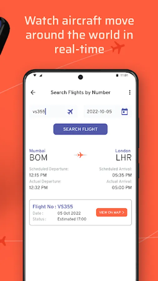2. Search Flight Status by Flight Number with Live Tracking On Map :- All you need to do is key in the Flight Number and the Flight Status app will you the Live Flight Status. The Flight Tracker will also allows you to Track the Flight on Map from it departure to its landing.