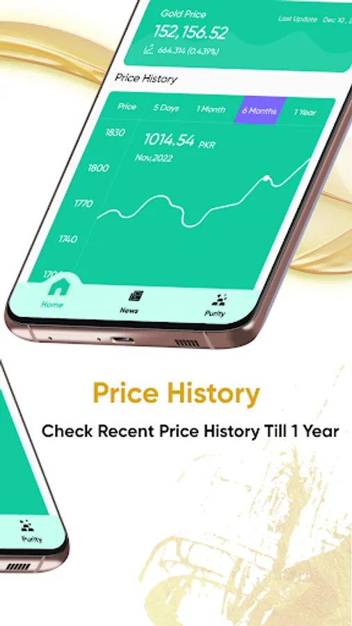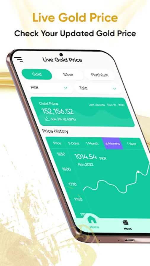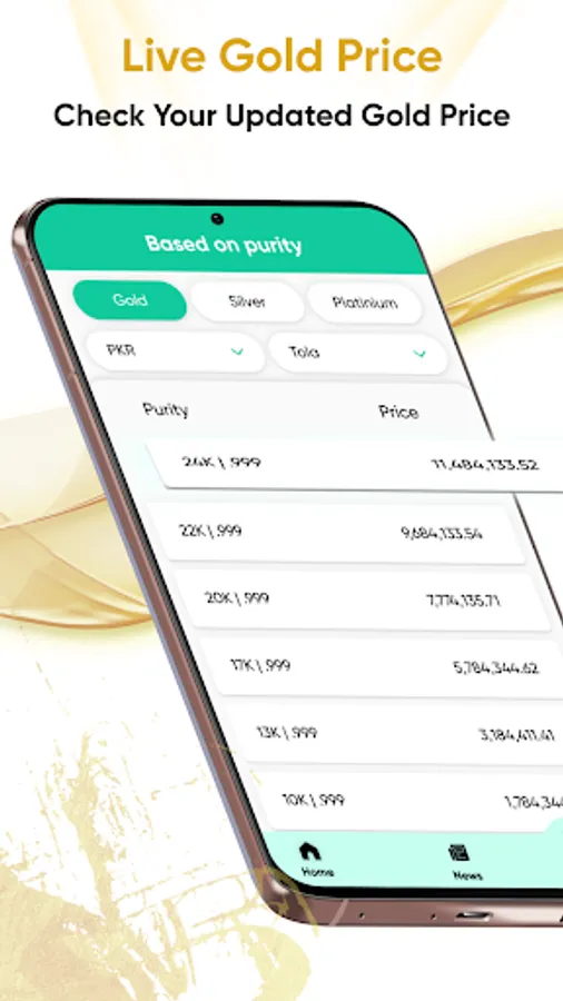 2. The interface of gold rate app in Pakistan has three main features; home, news, and purity.