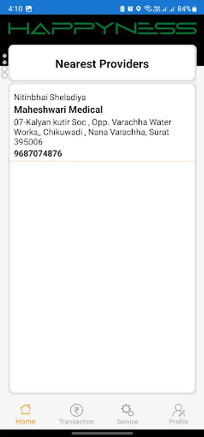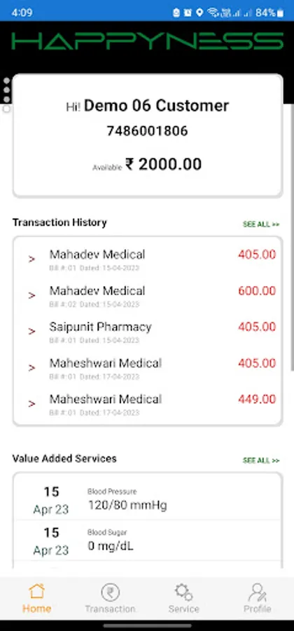 Happyness Healthcard is the Health freedom for Indian family, which gives certain credit limit and affordable and genuine medicines from trusted local stores alongwith certain free services like Blood pressure, Blood glucose, Heart rate, SpO2, Weight, etc. This App will give customer an overall information about Transactions and Services they availed, they can manage family members and check their nearest Services providers (Pharmacy store, Laboratories, Doctors, Hospitals). A Complete Healthcare Ecosystem.