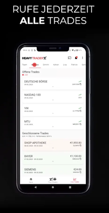 Watch our traders every trading day between 8:30 a.m. and 5:30 p.m. as they achieve the best possible performance on the markets month after month. You won't miss any more lucrative opportunities with the app, you'll learn a lot and at the same time you'll get the best impression of how daily, active stock market trading really works.