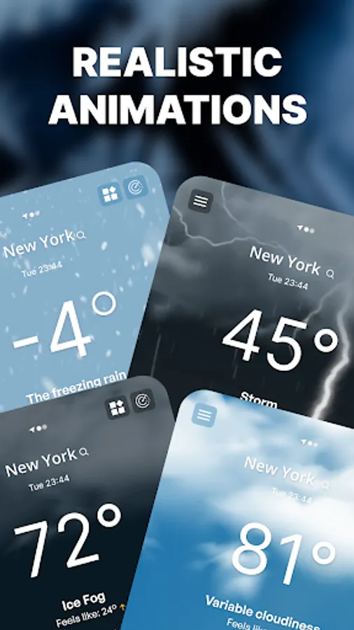 - Realistic rain, snow, moving clouds and thunderstorm animations