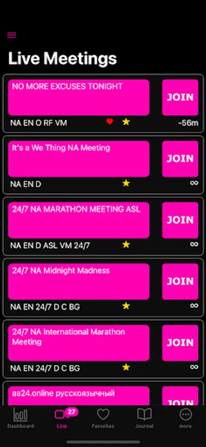 One of our standout features is the emphasis on live meetings. Unlike other online meeting directories, AA/NA Live! focuses exclusively on presenting you with recovery meetings that are currently live. This unique feature ensures that you have access to real-time support whenever you need it, setting us apart from the rest.