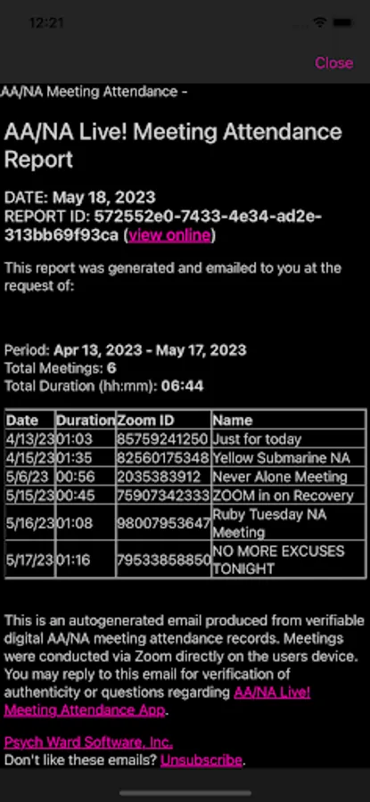 With AA/NA Live!, you have the freedom to attend meetings on your own terms. Unlike other services that require a minimum attendance duration, we allow you to participate for as long as you want, ensuring you receive credit for the exact time you invest in your recovery. Our attendance verification reports remain in your history for easy reference, eliminating the risk of losing them in cluttered email inboxes.