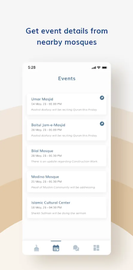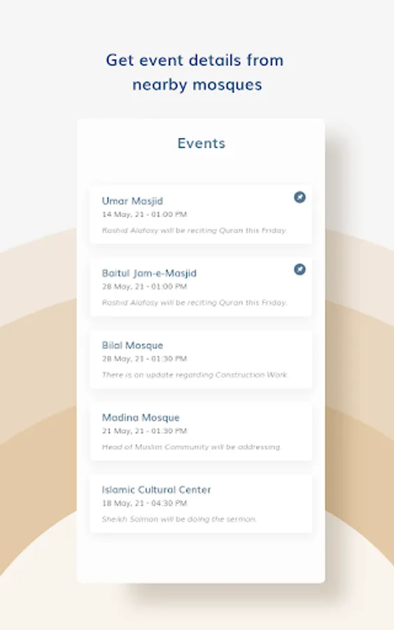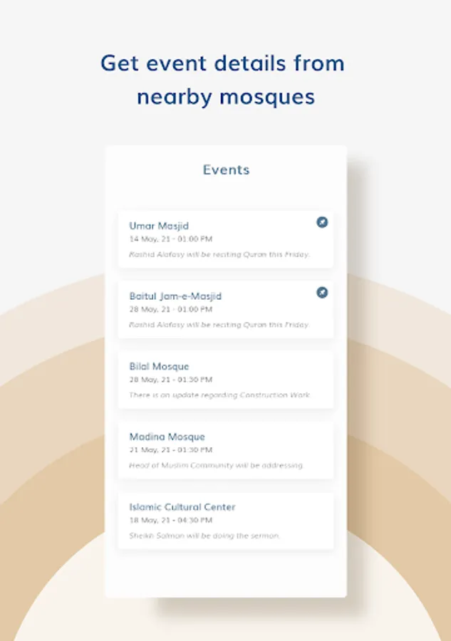 The Imam can create events and notify users for it. Imam can also create notification alerts of salat time change which will be sent to all the subscribers.