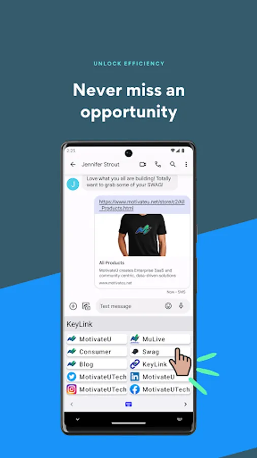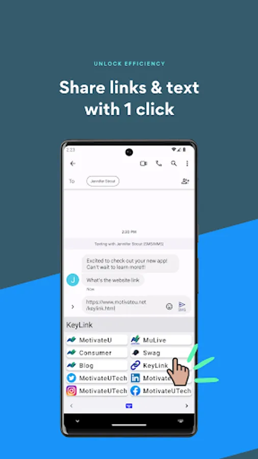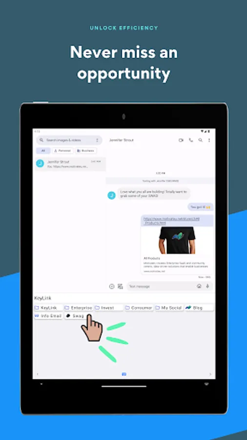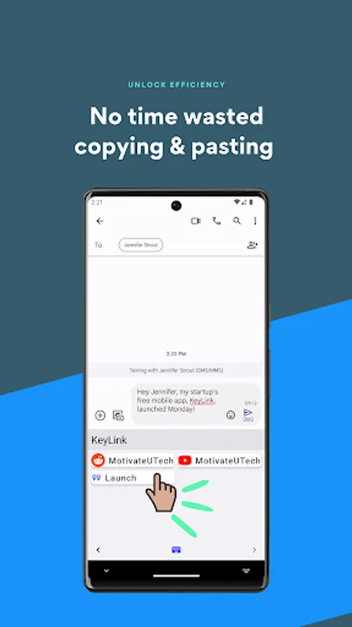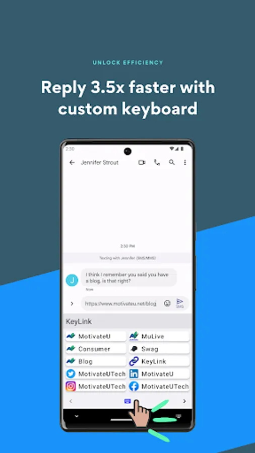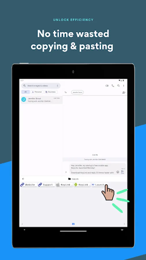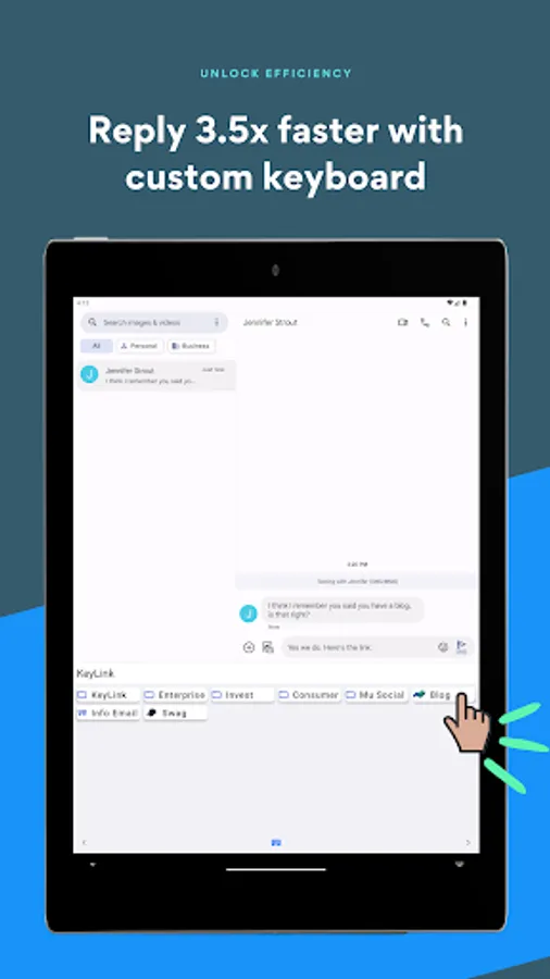 Responding to clients, prospects, investors, etc. is time consuming, but delaying a response is costly. With KeyLink you can quickly and easily add taglines, marketing messages, product or job descriptions, and other commonly shared information! Share sentences and paragraphs with just 1 click, no more copying and pasting dozens of messages from notes or docs! Efficiently reply to emails, texts, social media posts, direct messages, with your custom KeyLink keyboard!