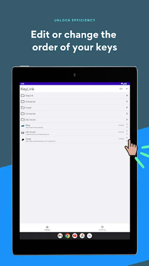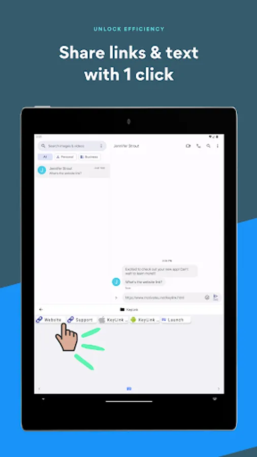 KeyLink is a custom keyboard that enables you to easily store, access, and share common links and text, such as your website, product and affiliate links, social media accounts, common responses to FAQs, taglines, and more. Download today and reply and apply within any app over 350% faster all with just 1 click of your custom keyboard!