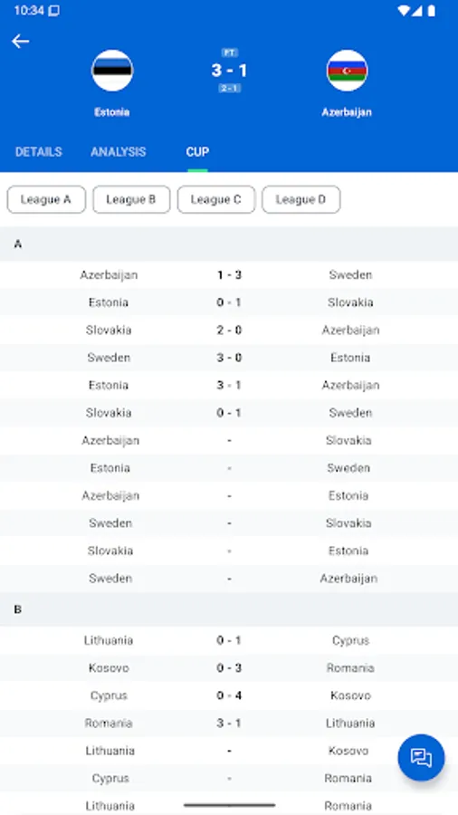Detailed schedules and standings for every team in both league and cup competitions.