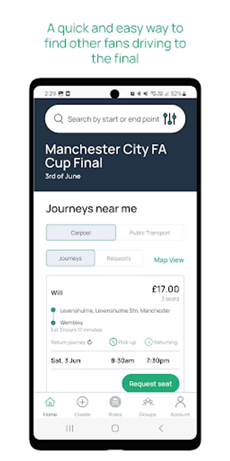 This is an app built by fans for fans. With the upcoming train strikes on the day of the final, we wanted to ensure that all fans were able to travel to the final and enjoy the day. This app enables you to find other fans of your club who are driving to the game who you can share the journey with, splitting the cost of petrol. We want to create a safe, community environment where fans can connect with one another to support each other and enjoy the final as much as possible.