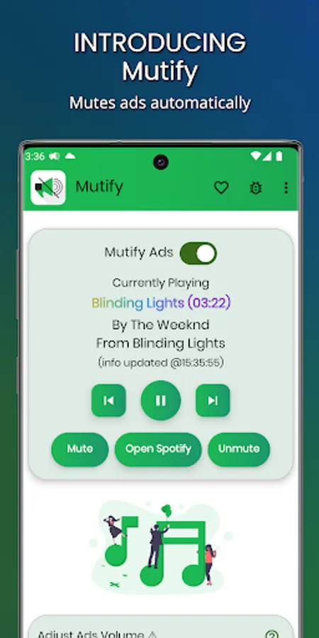 Note: Mutify is NOT a Spotify ad blocker, it just helps you lower the device's volume whenever an ad is detected playing. So, it does not interfere with your Spotify app or asks for any unnecessary permissions to work.