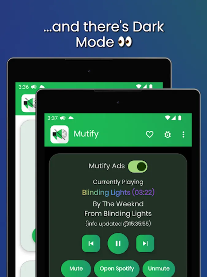 Developer Note - Mutify is developed and maintained by an individual dev, totally free of cost. Needless to say, I work on it part-time only. So please don’t send any unnecessary feature requests that don't entertain the app’s core functionality. Being a Spotify fan myself, I genuinely believe that this app will improve the music listening experience for those who cannot afford Spotify premium at the moment. However, if you want to enjoy the music listening experience to the fullest - I would highly recommend getting yourself a Spotify premium subscription. Believe me, It’s totally worth it!