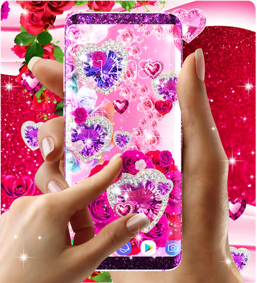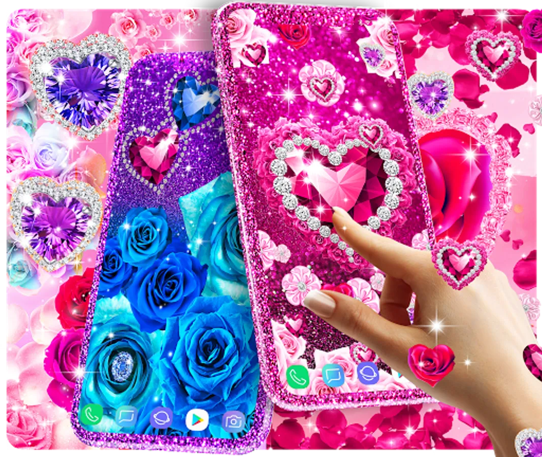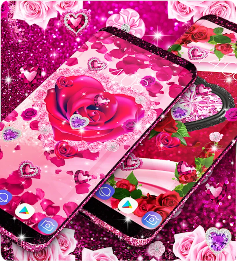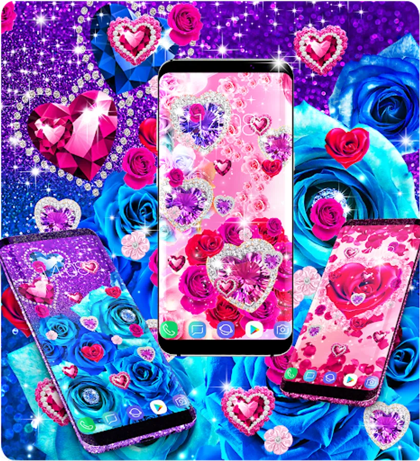 Live wallpaper that is designed for girls and women who love diamonds, roses and sparkling glitter backgrounds. It features pink diamonds with beautiful design that make your wallpaper very cool and stylish. You can choose from backgrounds with blue roses , red roses, pink or purple diamonds and you can add animations with diamond hearts , red rose hearts and pink magenta roses or glitter stars.
