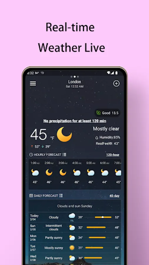This free weather app offers all the features: weather forecast for current location, manually added city weather forecast, weather forecast for up to 120 hours, weather forecast for up to 45 days, advanced rainfall forecast accurate to the minute, multiple types of weather radar, timely weather alerts, various styles of weather widgets, custom notification bar, beautiful themes, colorful weather background.