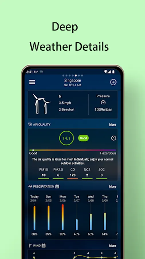 - Detailed weather information for the next 25 days, precipitation, precipitation probability, wind direction, temperature, temperature change trend, air quality forecast, and an overview of weather information for each day